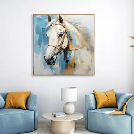 Yağlı Boya Dokulu Tablo Mavi Fonda Beyaz At Altın Çerçeveli