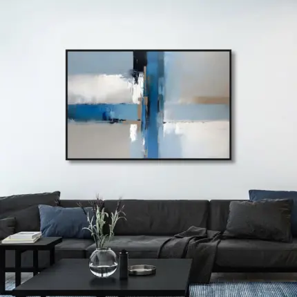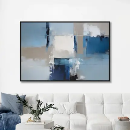 Yağlı Boya Dokulu Tablo Mavi Gri Beyaz Soyut Siyah Çerçeveli