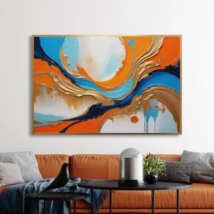 Yağlı Boya Dokulu Tablo Mavi Turuncu Beyaz Soyut Altın Çerçeveli