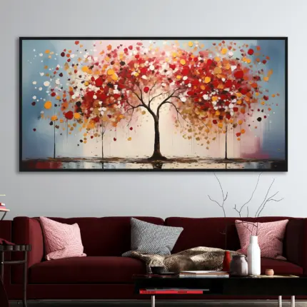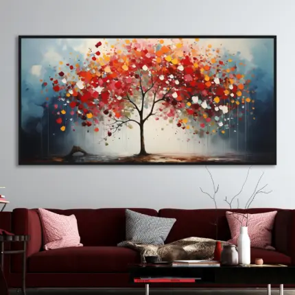 Yağlı Boya Dokulu Tablo Sonbahar Kırmızı Tek Ağaç Siyah Çerçeveli