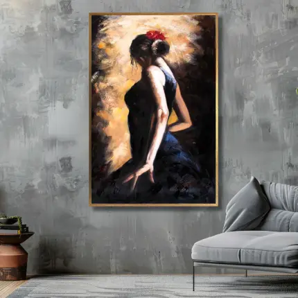 Yağlı Boya Dokulu Tablo Siyah Elbiseli İspanyol Dansçı Kadın Altın Çerçeveli