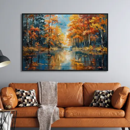 Yağlı Boya Dokulu Tablo Sonbahar Ağaçları Manzara Siyah Çerçeveli