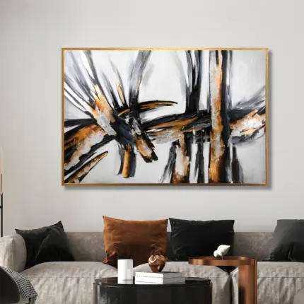 Yağlı Boya Dokulu Tablo Siyah Beyaz Gold Soyut Altın Çerçeveli