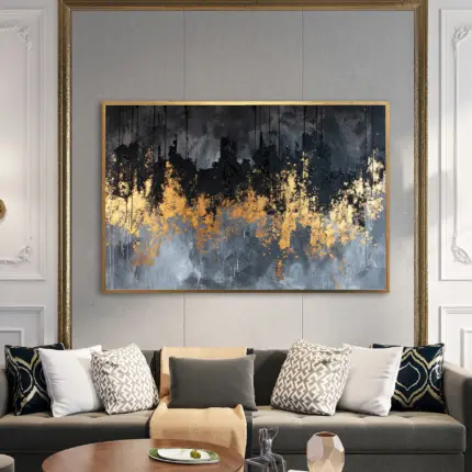 Yağlı Boya Dokulu Tablo Siyah Gri Altın Şehir Manzara Altın Çerçeveli