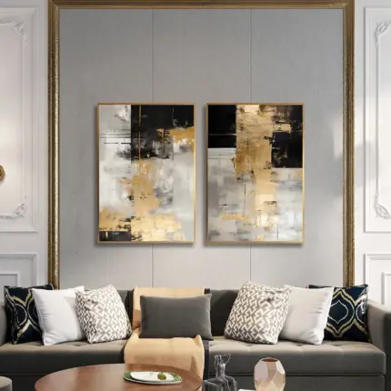 Yağlı Boya Dokulu Tablo Siyah Gri Altın Soyut İkili Set Altın Çerçeveli