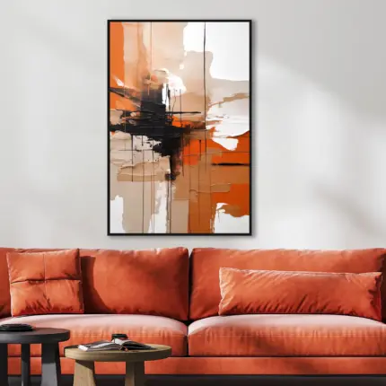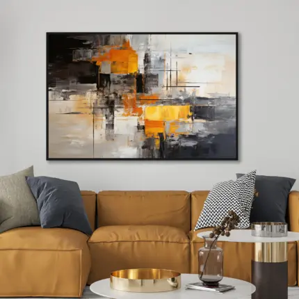 Yağlı Boya Dokulu Tablo Siyah Beyaz Turuncu Soyut Siyah Çerçeveli