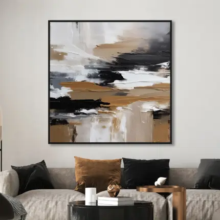 Yağlı Boya Dokulu Tablo Siyah Beyaz Kahve Soyut Altın Çerçeveli