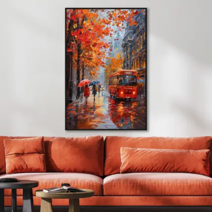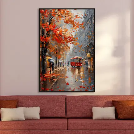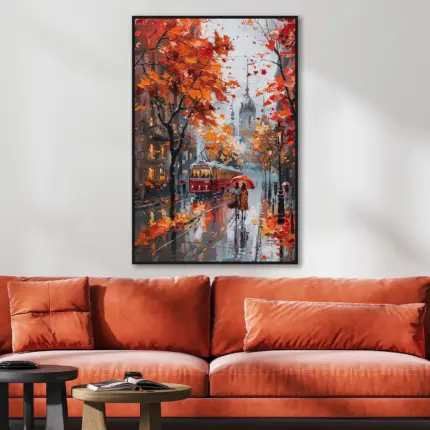 Yağlı Boya Dokulu Tablo Sonbahar Şehir Manzarası Siyah Çerçeveli