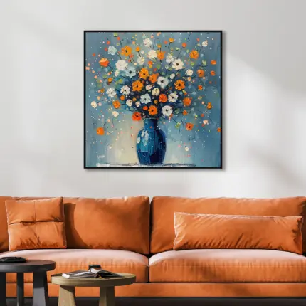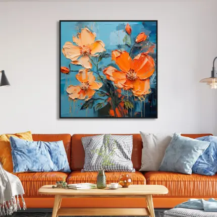 Yağlı Boya Dokulu Tablo Spatula Turuncu Çiçekler Siyah Çerçeveli