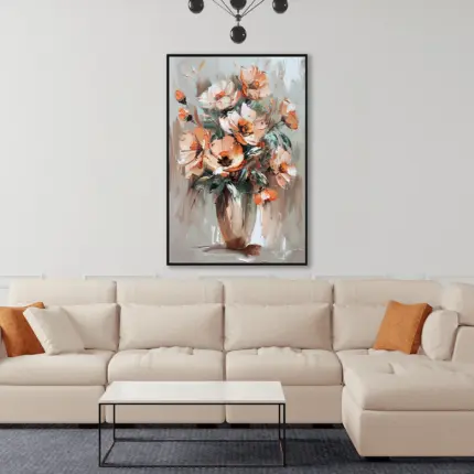 Yağlı Boya Dokulu Tablo Vazoda Modern Çiçekler Siyah Çerçeveli