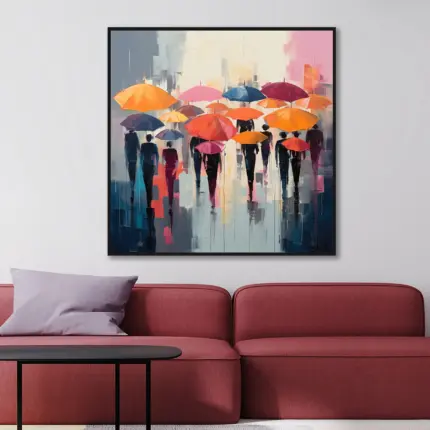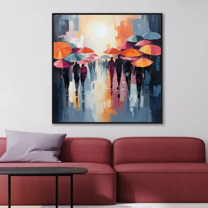 Yağlı Boya Dokulu Tablo Yağmurda Renkli Şemsiyeli İnsanlar Siyah Çerçeveli