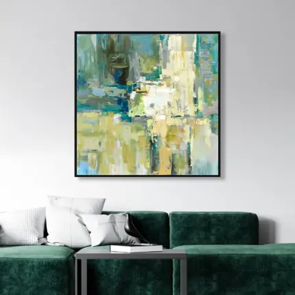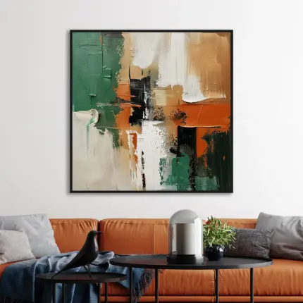 Yağlı Boya Dokulu Tablo Yeşil Bej Kare Soyut Siyah Çerçeveli