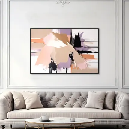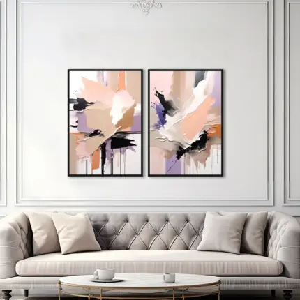 Yağlı Boya Dokulu TabloLila Bej Soyut İkili Set Siyah Çerçeveli