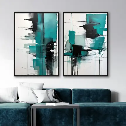 Yağlı Boya Dokulu Tablo Yeşil Siyah Beyaz Soyut İkili Set Siyah Çerçeveli