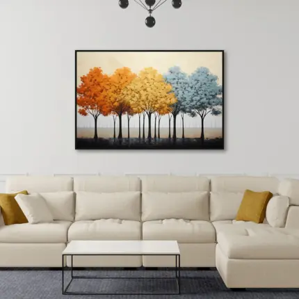 Yağlı Boya Dokulu Tablo Renkli Sonbahar Ağaçları Siyah Çerçeveli