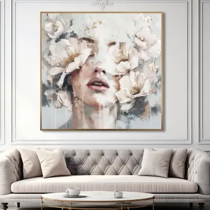 Yağlı Boya Dokulu Tablo Kadın ve Beyaz Çiçekler Altın Çerçeveli
