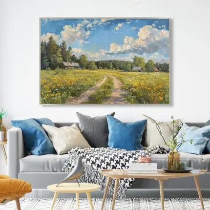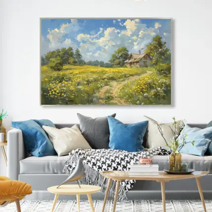 Yağlı Boya Dokulu Tablo Yeşil Doğa ve Köy Evleri Manzarası Gümüş Çerçeveli