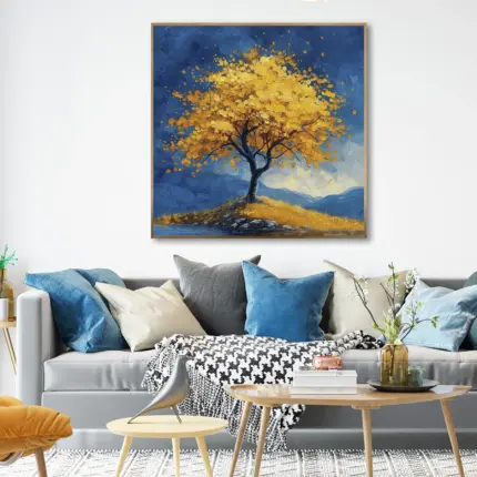 Yağlı Boya Dokulu Tablo Tekli Sarı Ağaç Altın Çerçeveli