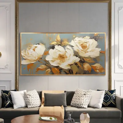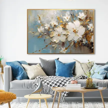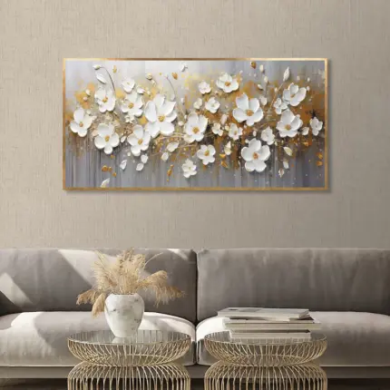 Yağlı Boya Dokulu Tablo Spatula Beyaz Çiçekler Altın Çerçeveli