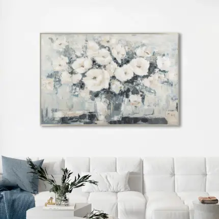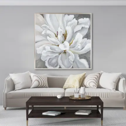 Yağlı Boya Dokulu Tablo Soyut Tekli Beyaz Çiçek Gümüş Çerçeveli