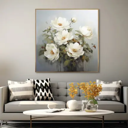 Yağlı Boya Dokulu Tablo Vazoda Beyaz Modern Çiçekler Altın Çerçeveli