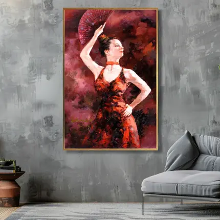 Yağlı Boya Dokulu Tablo Yelpazeli İspanyol Dansçı Kadın Altın Çerçeveli