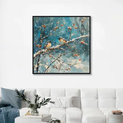Yağlı Boya Dokulu Tablo Karlı Havada Dalda Kuşlar Siyah Çerçeveli
