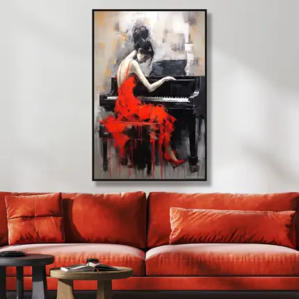 Yağlı Boya Dokulu Tablo Kırmızı Elbiseli Piyano Çalan Kadın Siyah Çerçeveli