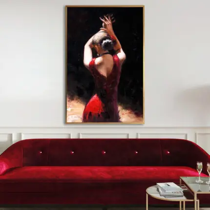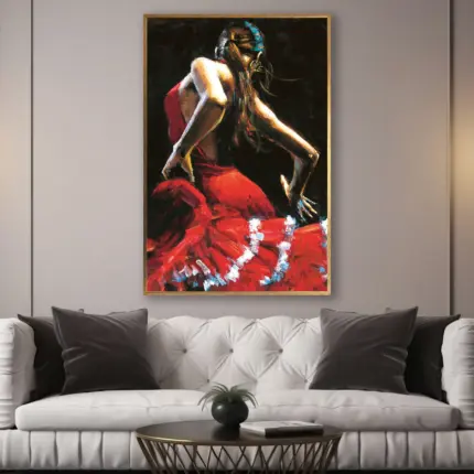 Yağlı Boya Dokulu Tablo Kırmızı Elbiseli İspanyol Dansçı Kadın Altın Çerçeveli