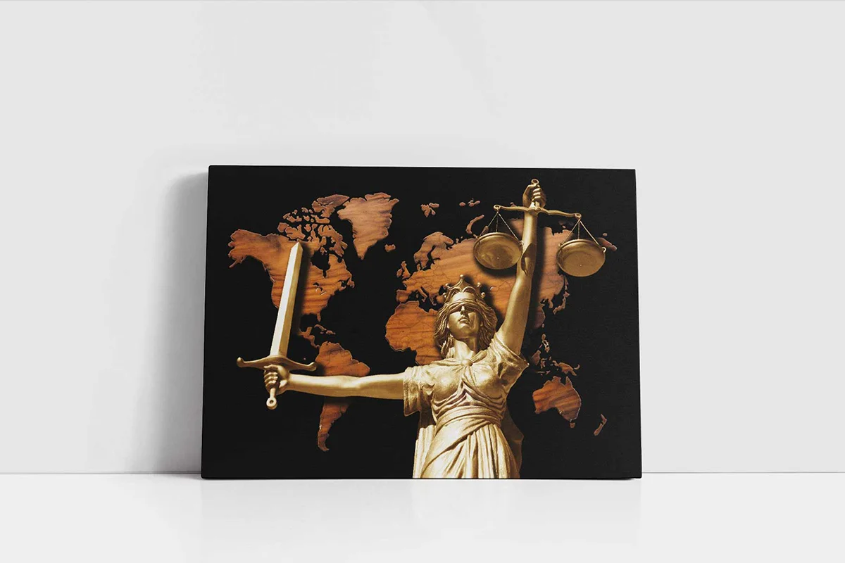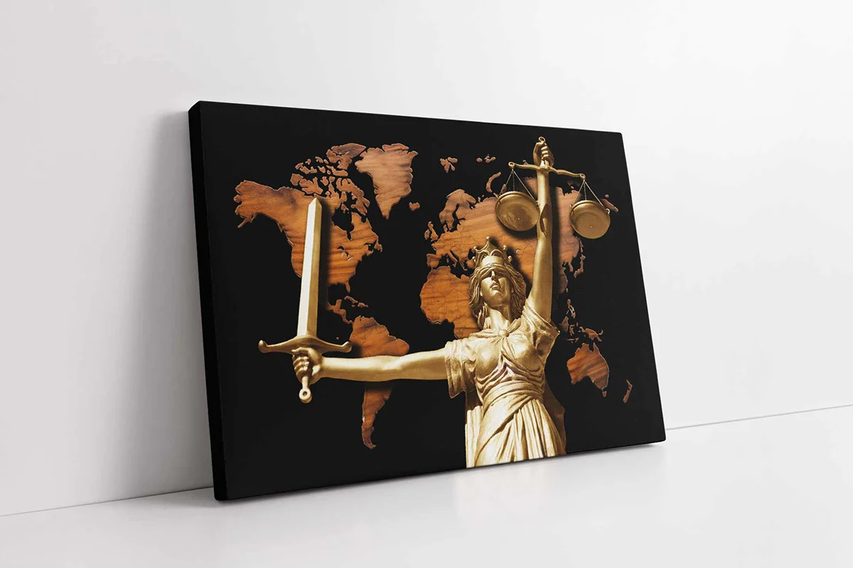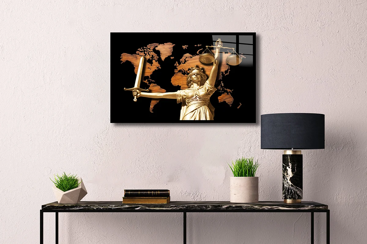 Tablosan Adalet Tanrıçası Ve Dünya Haritası | Kanvas Tablo | Cam Tablo | Mdf Tablo | B33396