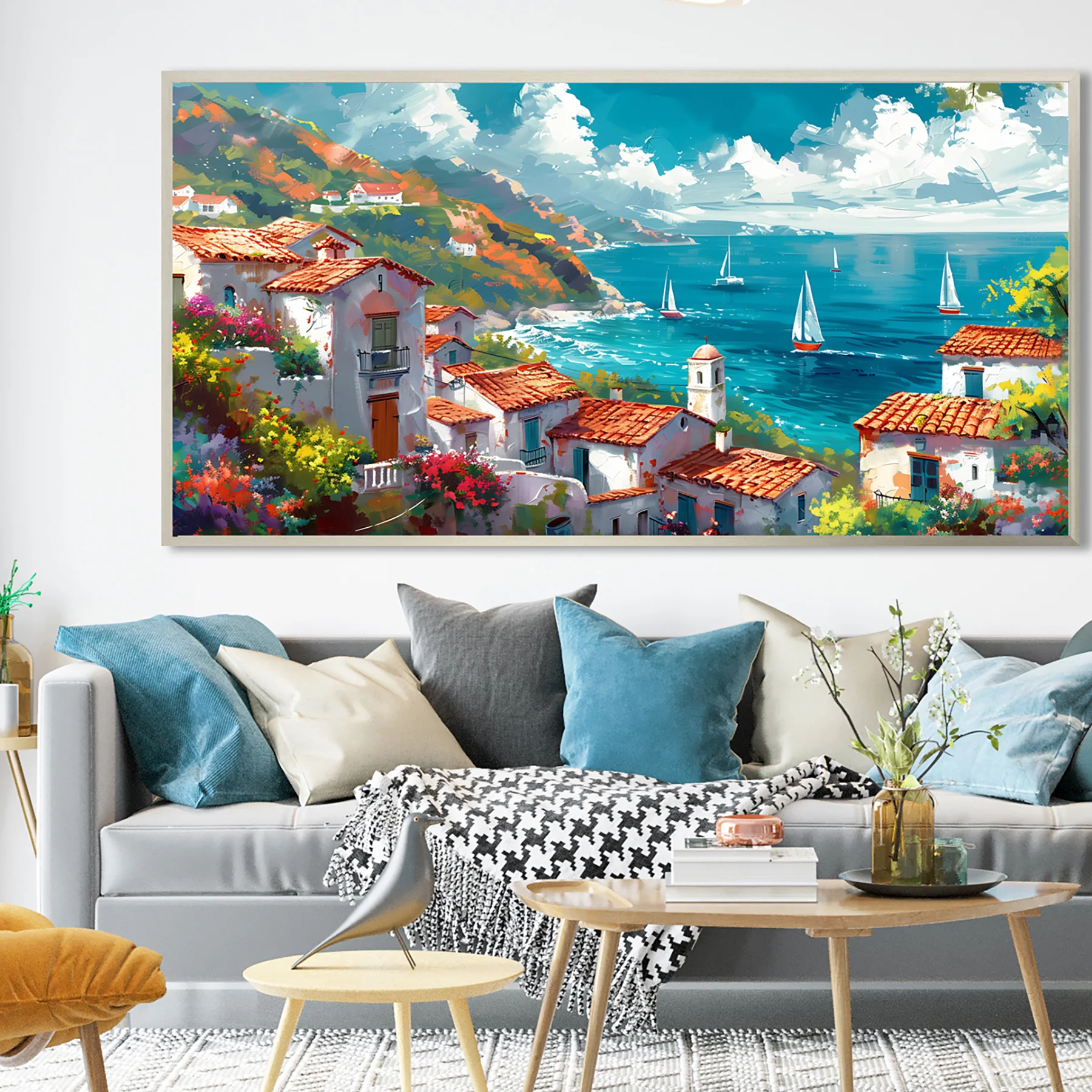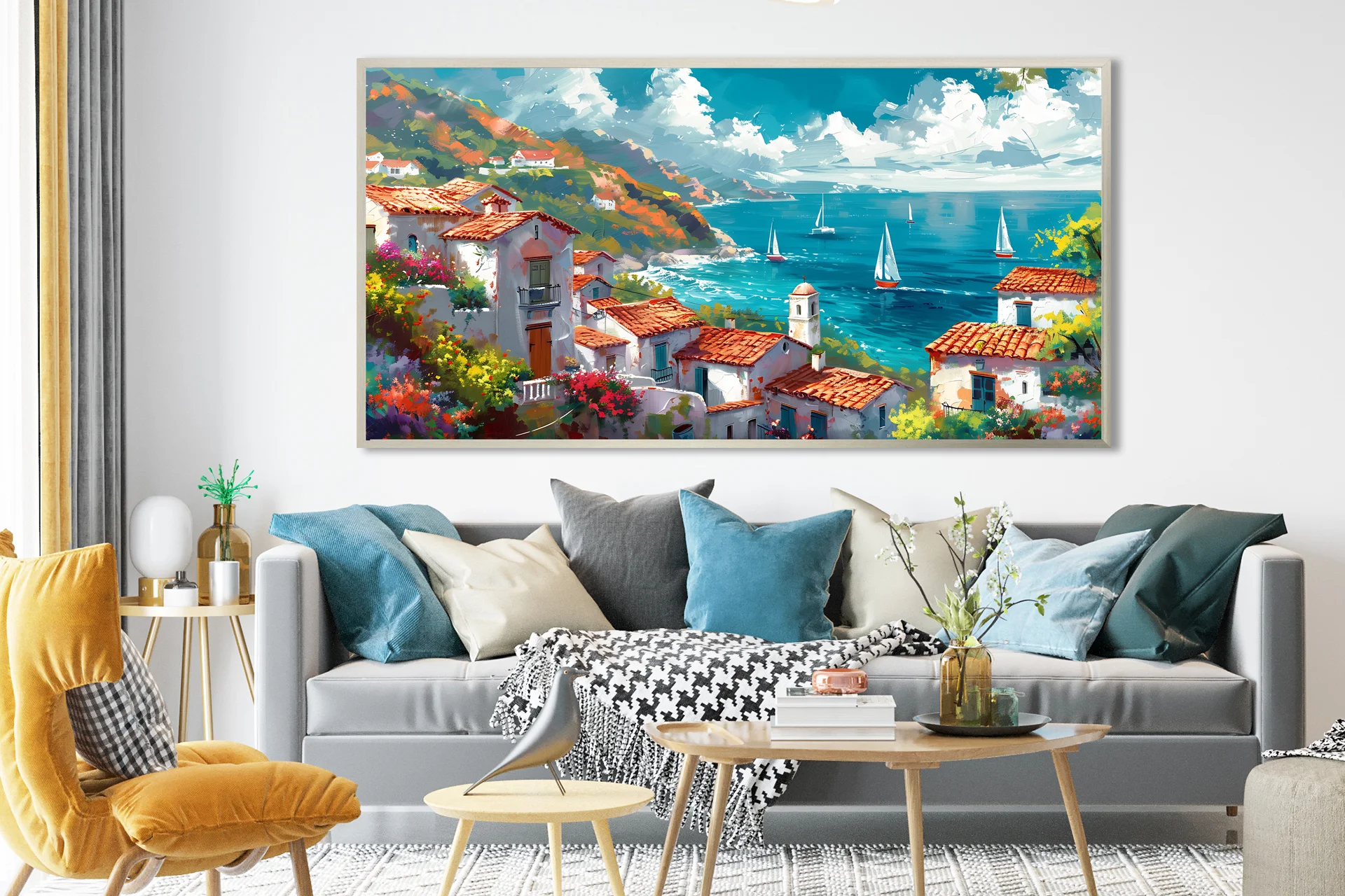 Etiketler: Akdeniz, Çerçeveli, Evleri, Gümüş, Yağlı Boya Dokulu Tablo, Yatay