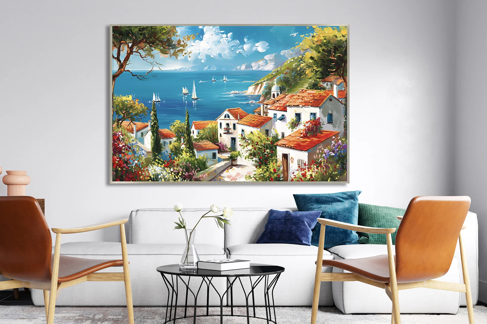 Yağlı Boya Dokulu Tablo Akdeniz Evleri Gümüş Çerçeveli