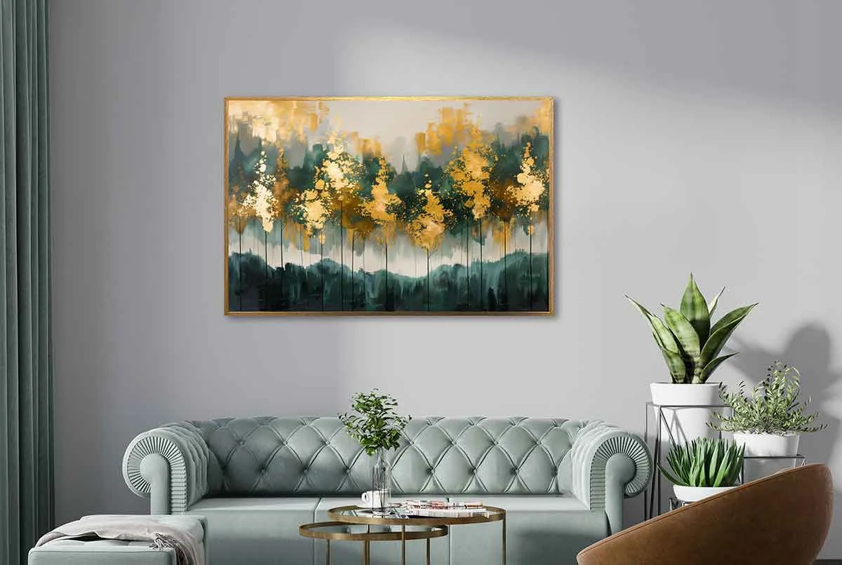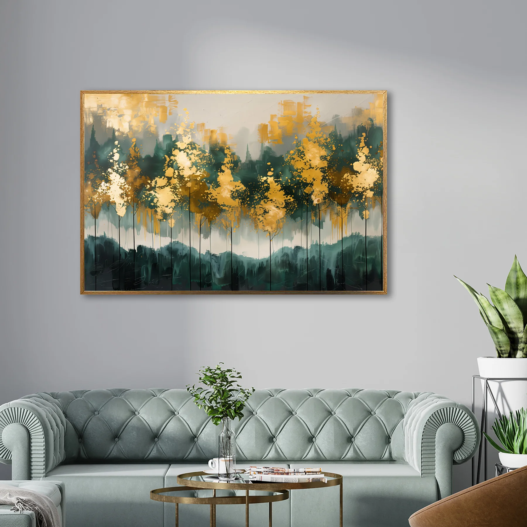 Yağlı Boya Dokulu Tablo Altın Yeşil Ağaçlı Soyut Manzara Altın Çerçeveli