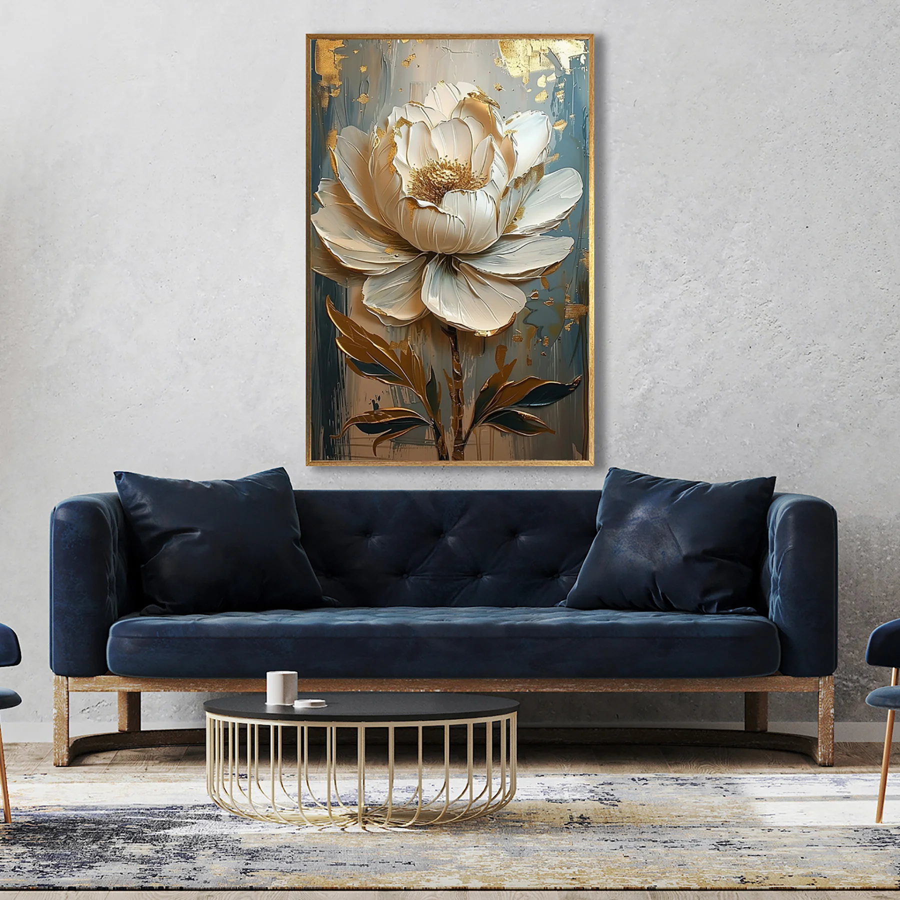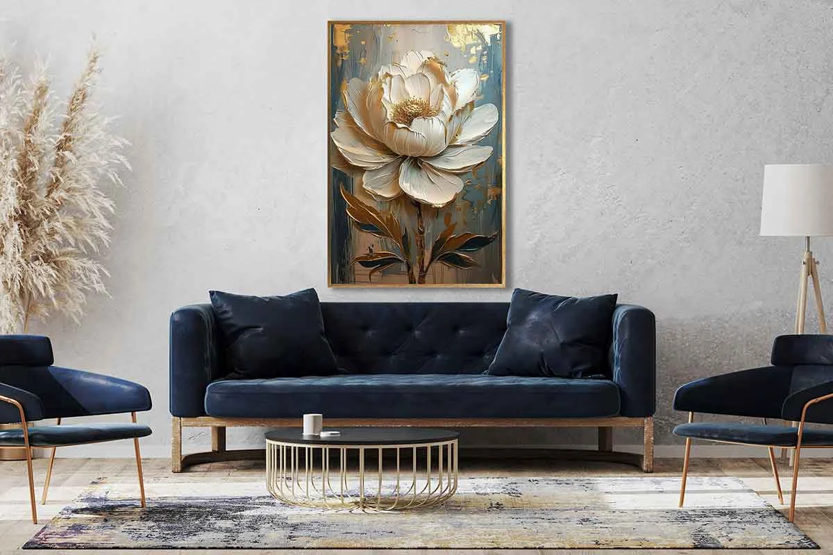Yağlı Boya Dokulu Tablo Mavi Fonda Beyaz Altın Çiçek Altın Çerçeveli