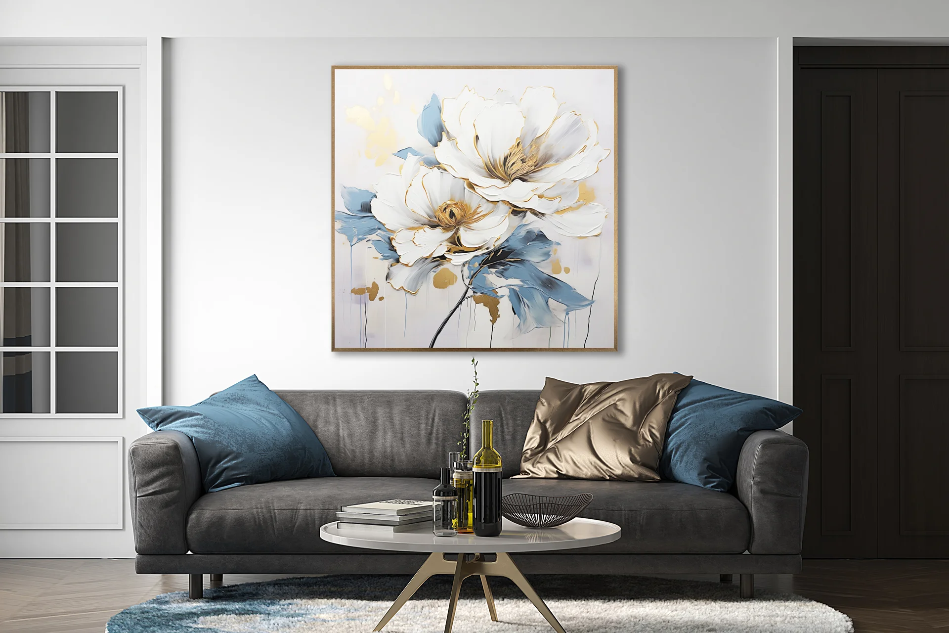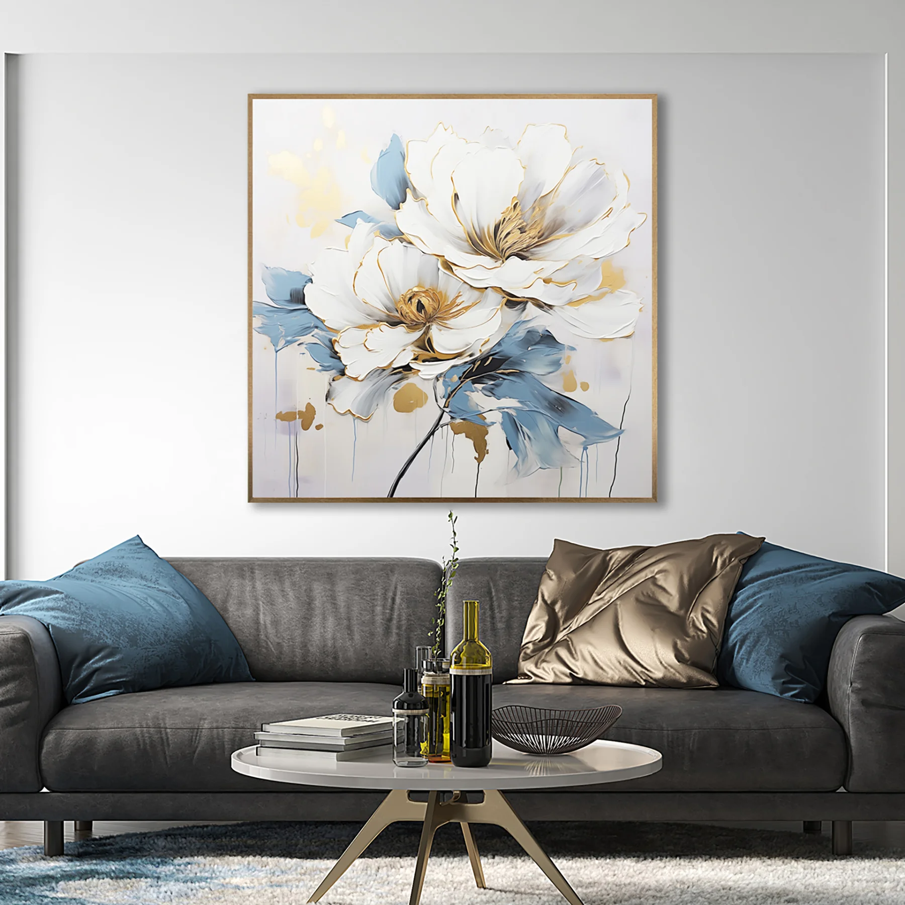Etiketler: Altın, Beyaz, Çerçeveli, Çiçekler, Kare, Soyut, Yağlı Boya Dokulu Tablo
