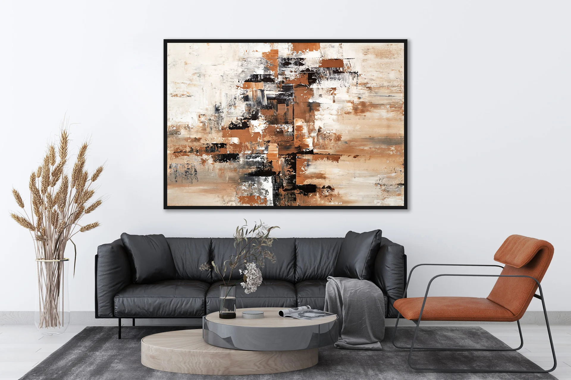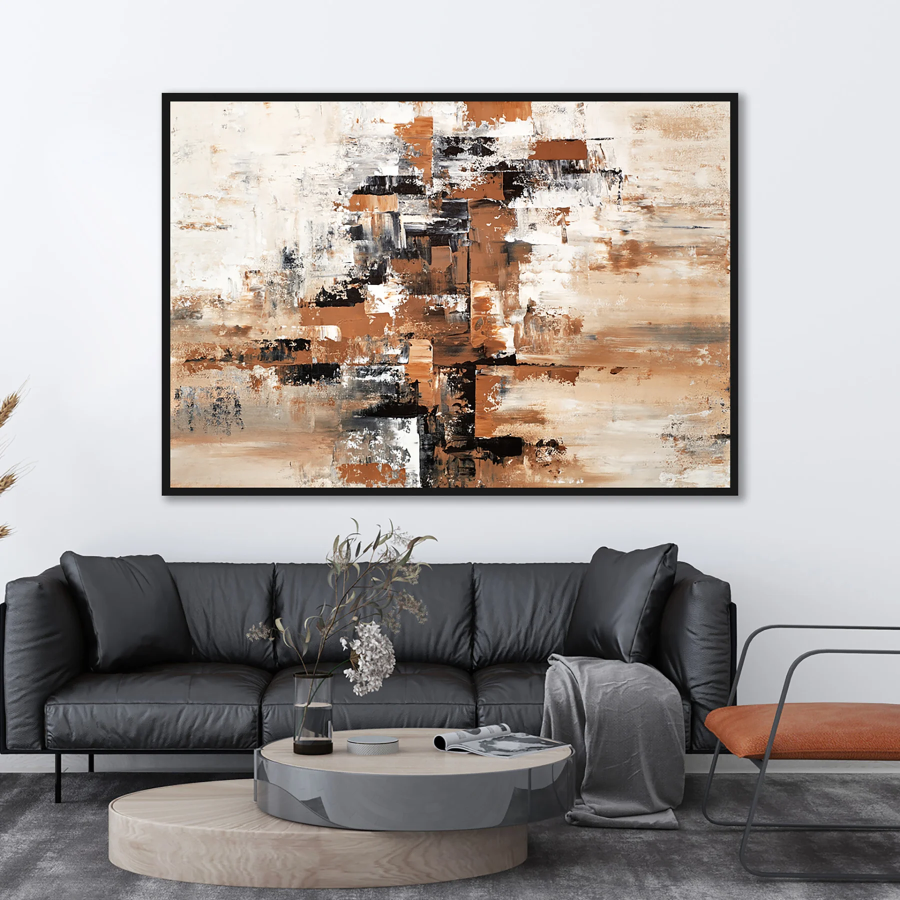 Yağlı Boya Dokulu Tablo Kahverengi Bej Soyut Siyah Çerçeveli