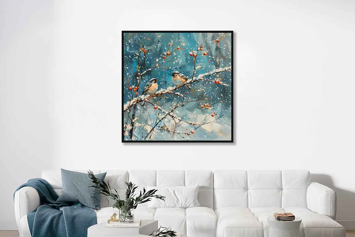 Yağlı Boya Dokulu Tablo Karlı Havada Dalda Kuşlar Siyah Çerçeveli