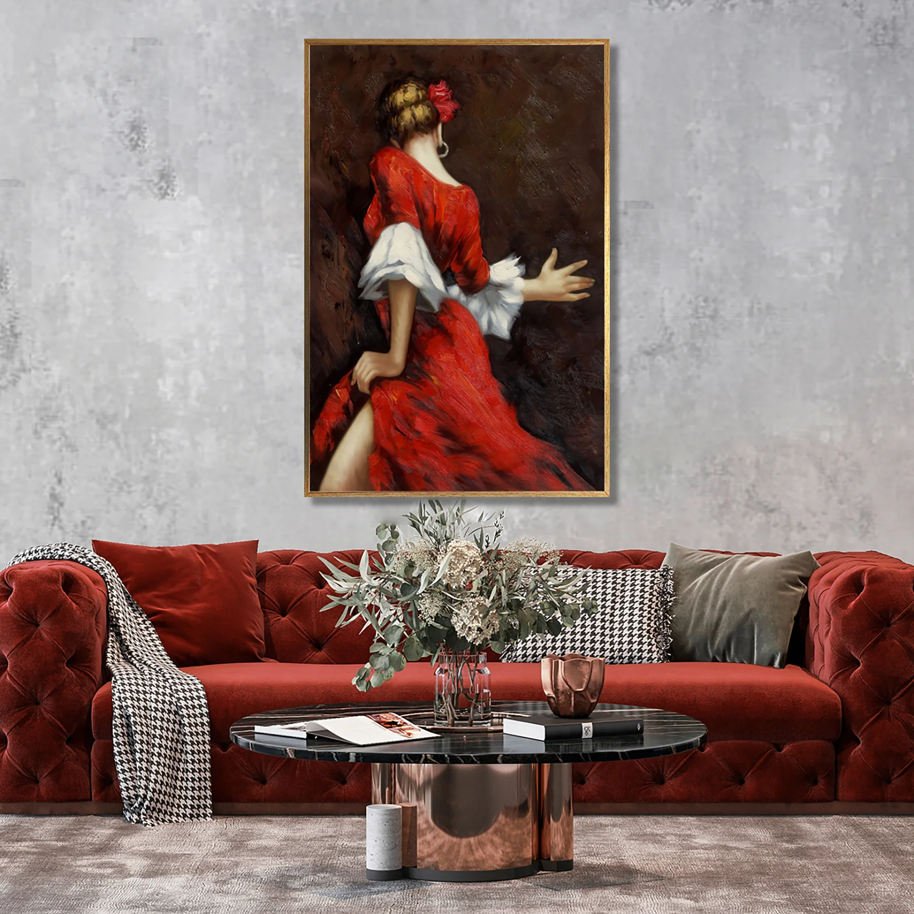 Yağlı Boya Dokulu Tablo Kırmızı Elbiseli İspanyol Dansçı Kadın Altın Çerçeveli