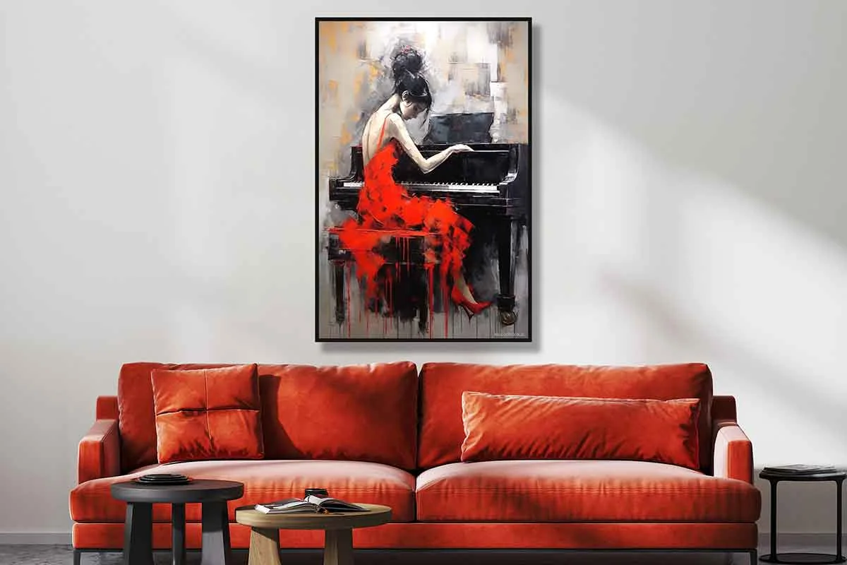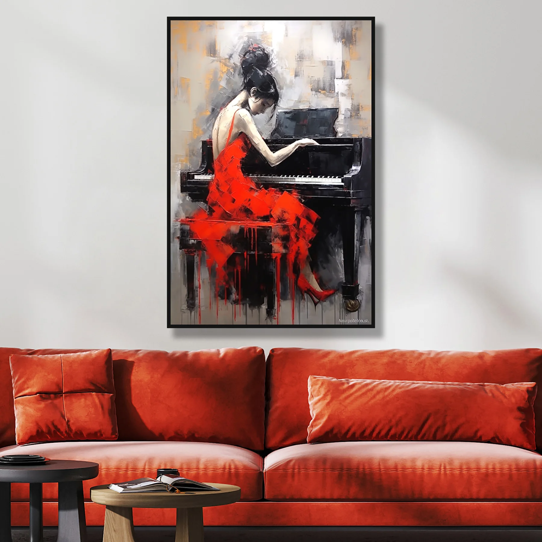 Yağlı Boya Dokulu Tablo Kırmızı Elbiseli Piyano Çalan Kadın Siyah Çerçeveli