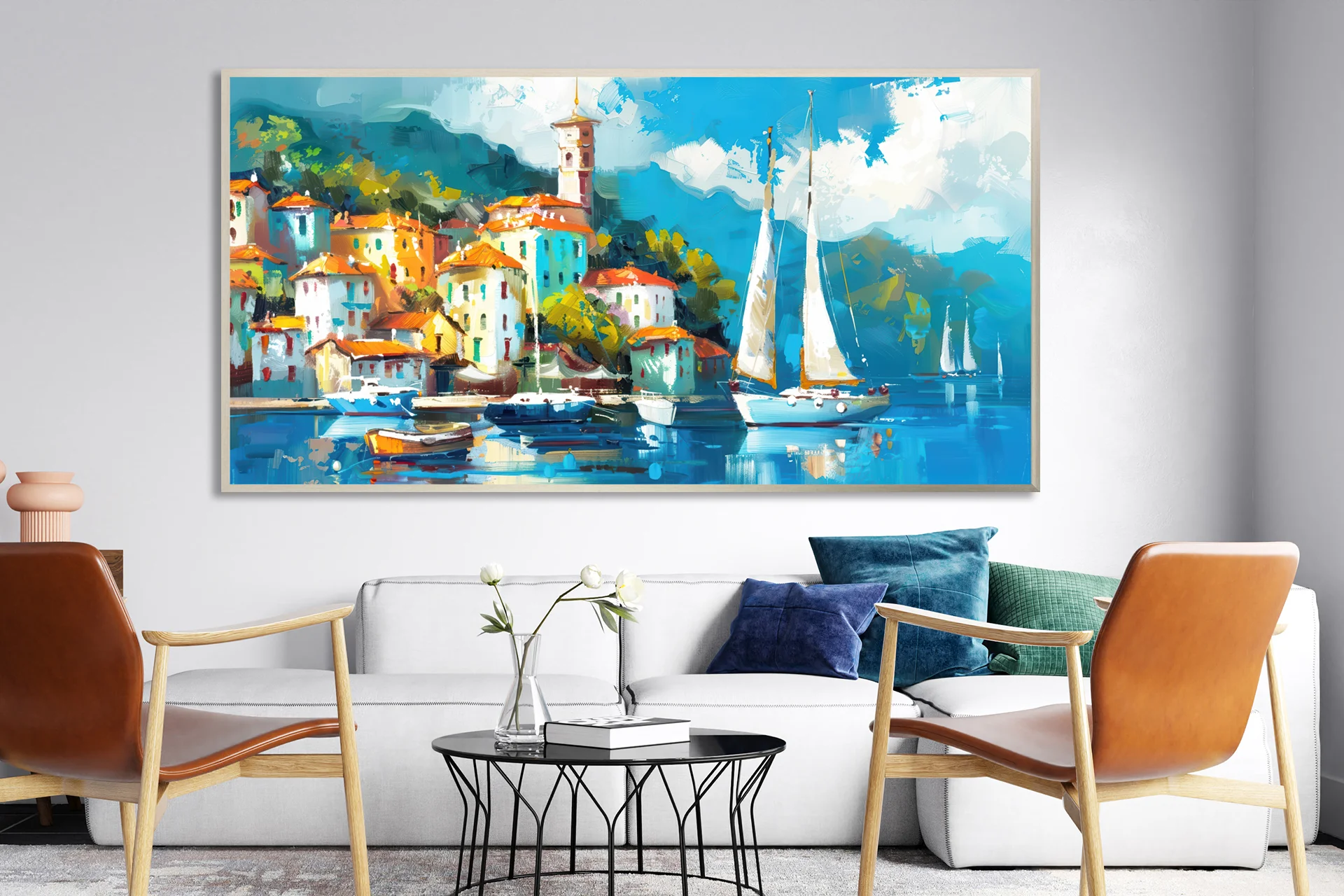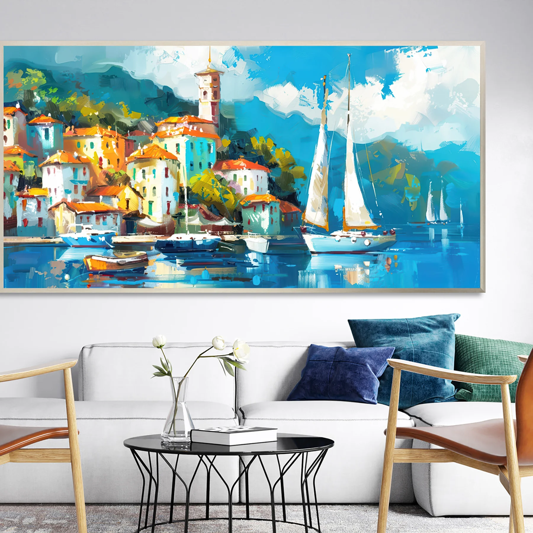 Yağlı Boya Dokulu Tablo Kıyıda Yelkenli ve Evler Gümüş Çerçeveli