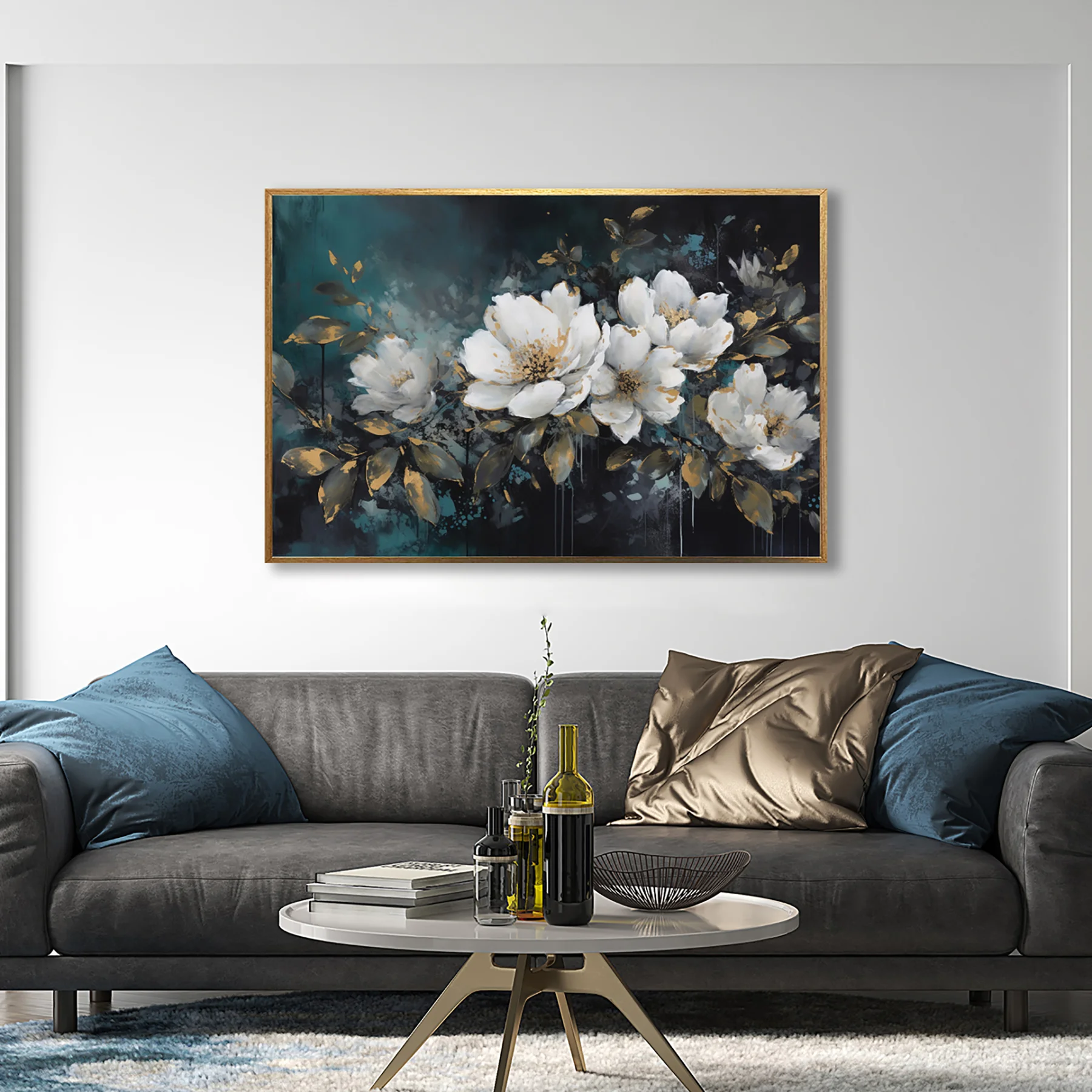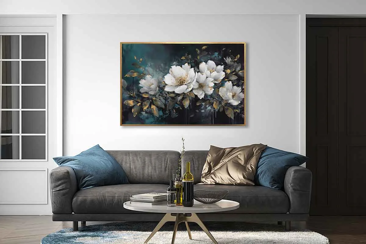 Yağlı Boya Dokulu Tablo Koyu Fonda Beyaz Çiçekler Altın Çerçeveli