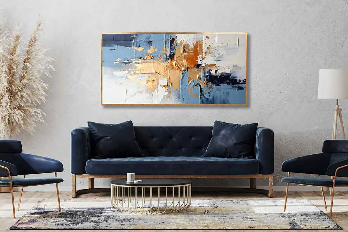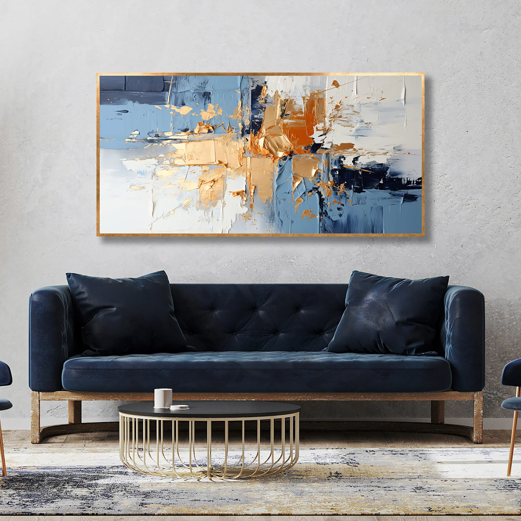 Yağlı Boya Dokulu Tablo Mavi Altın Gold Soyut Altın Çerçeveli