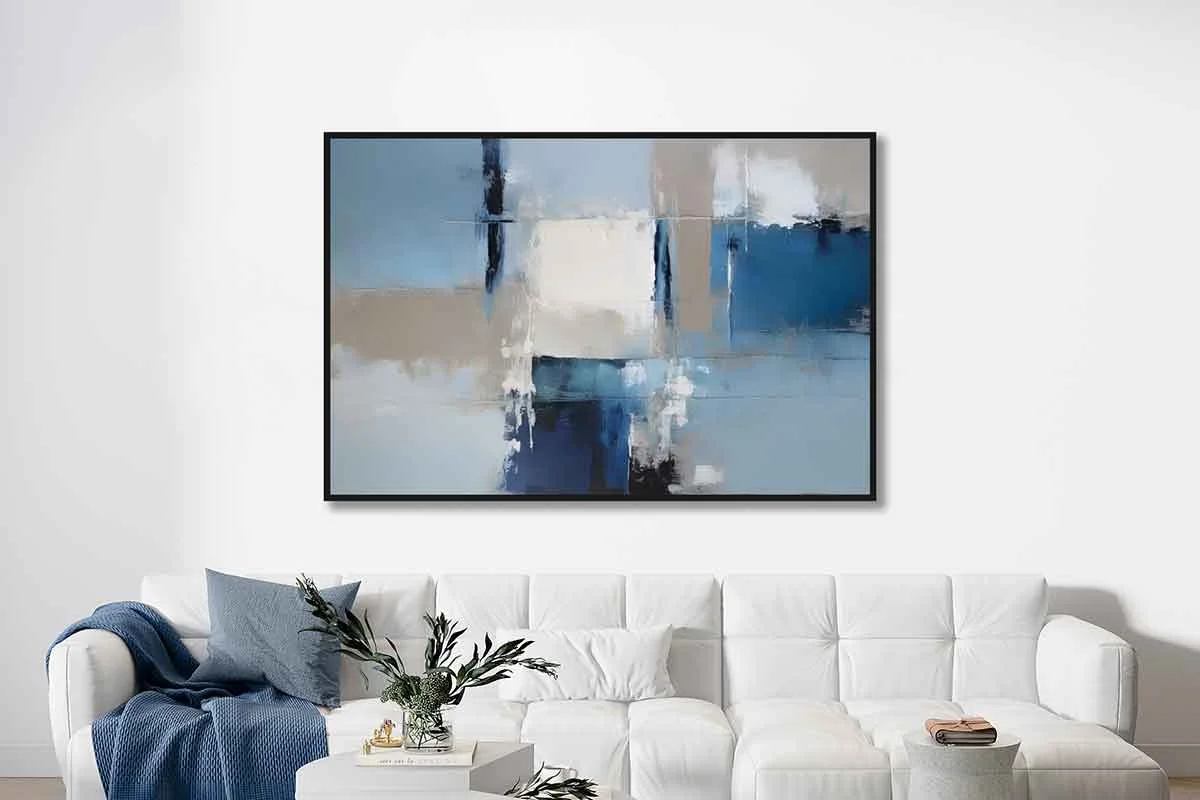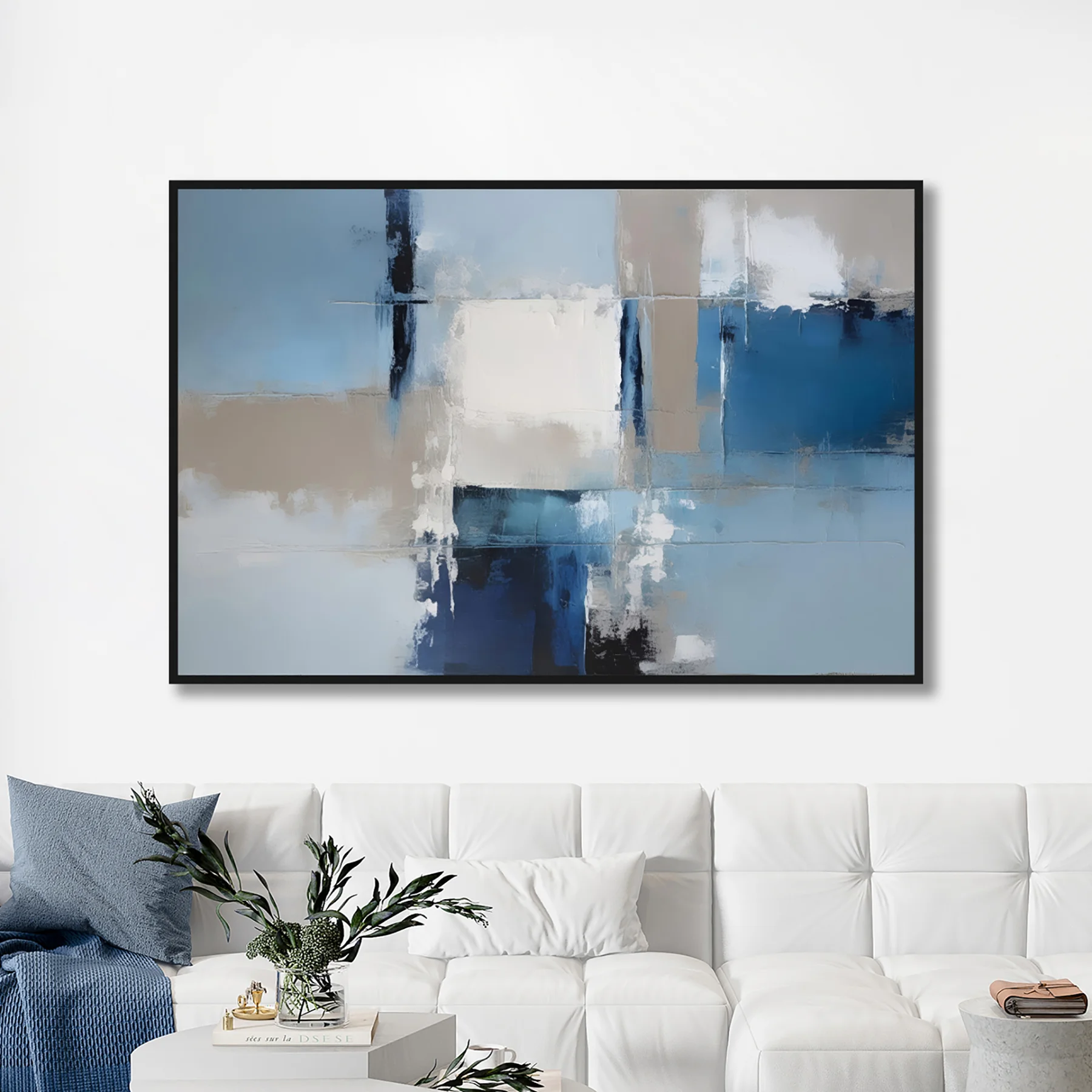 Yağlı Boya Dokulu Tablo Mavi Beyaz Soyut Siyah Çerçeveli