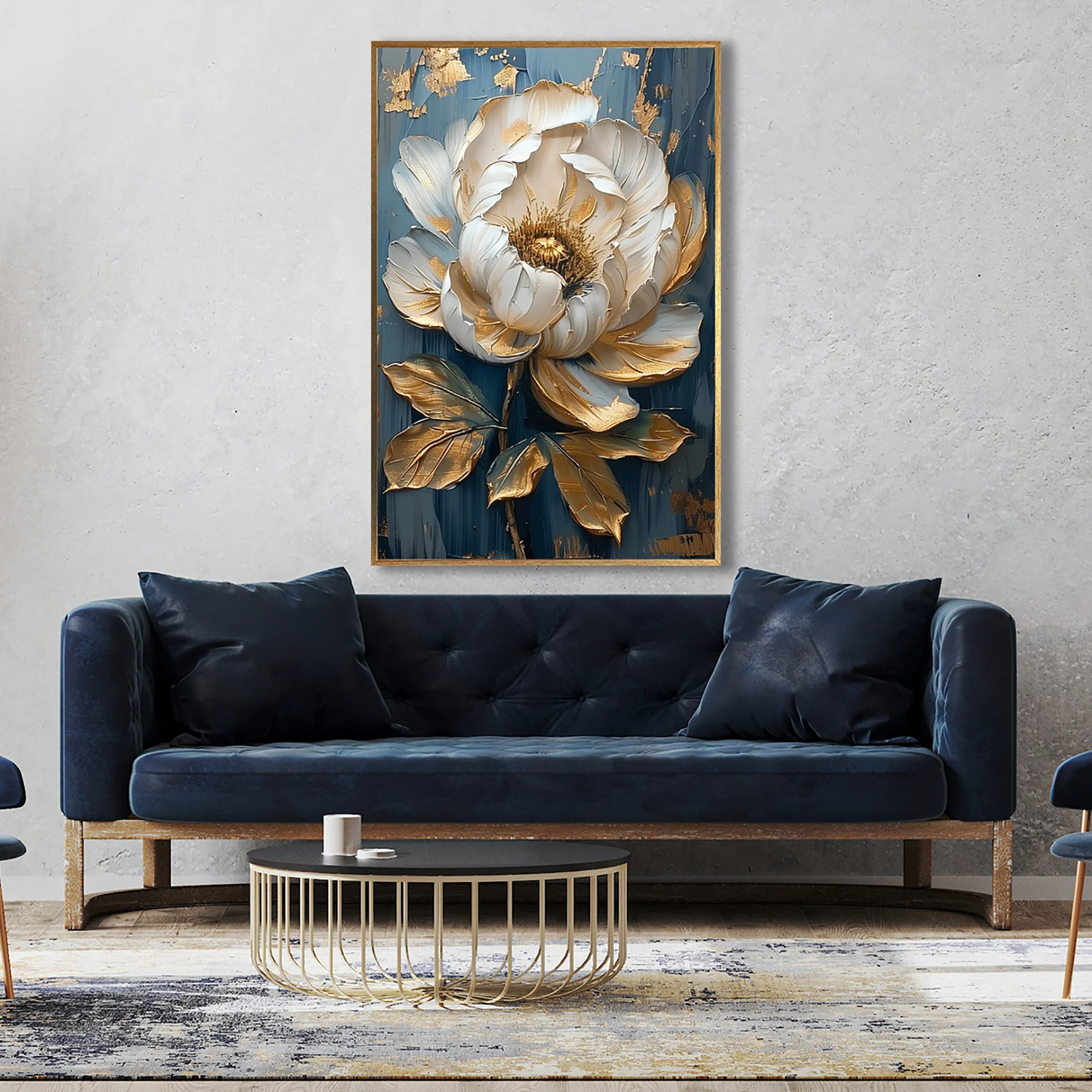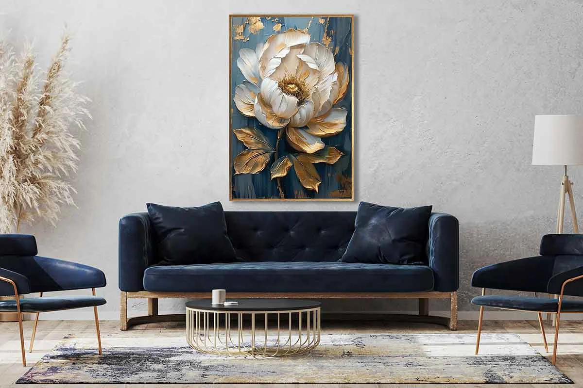 Yağlı Boya Dokulu Tablo Mavi Fonda Beyaz Altın Çiçek Altın Çerçeveli