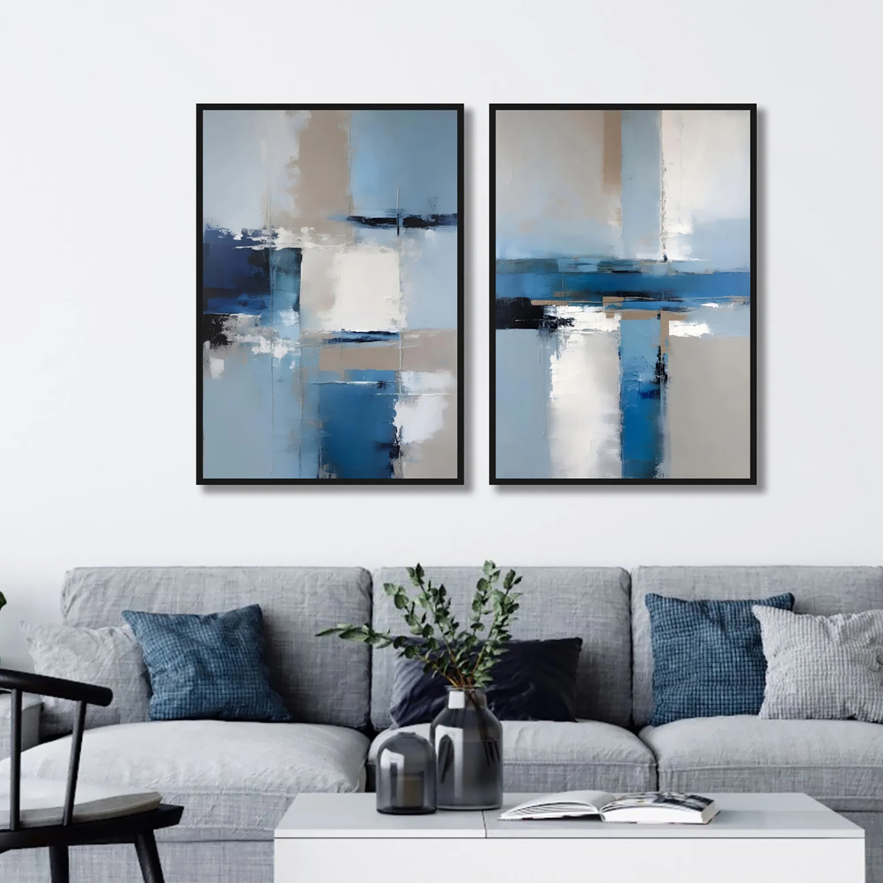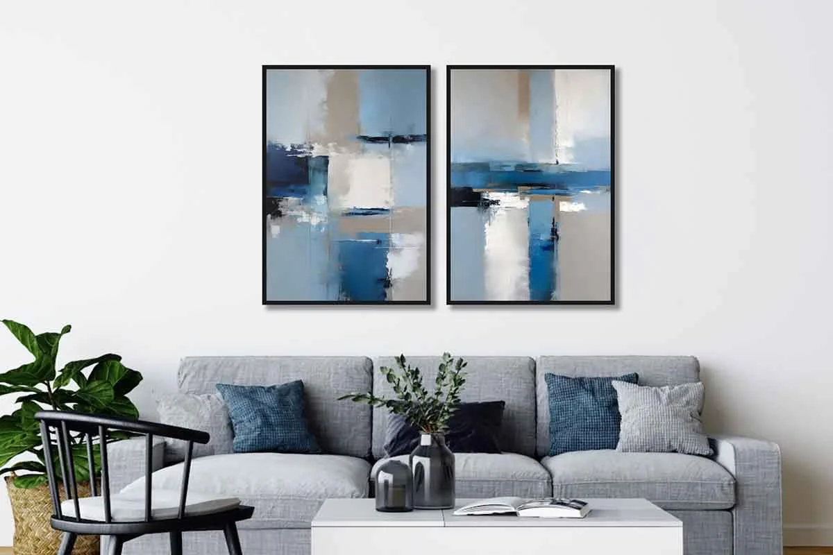 Yağlı Boya Dokulu Tablo Mavi Gri Beyaz Soyut İkili Set Siyah Çerçeveli