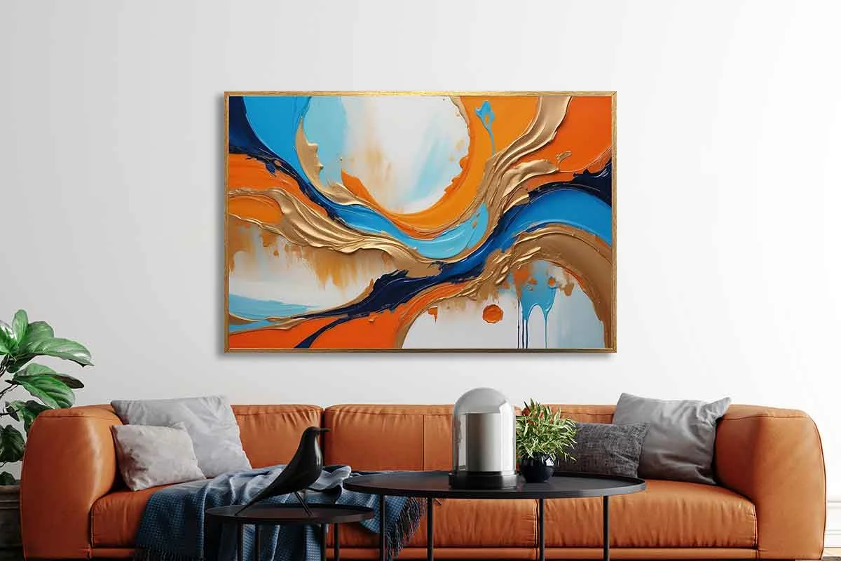 Yağlı Boya Dokulu Tablo Mavi Turuncu Beyaz Soyut Altın Çerçeveli