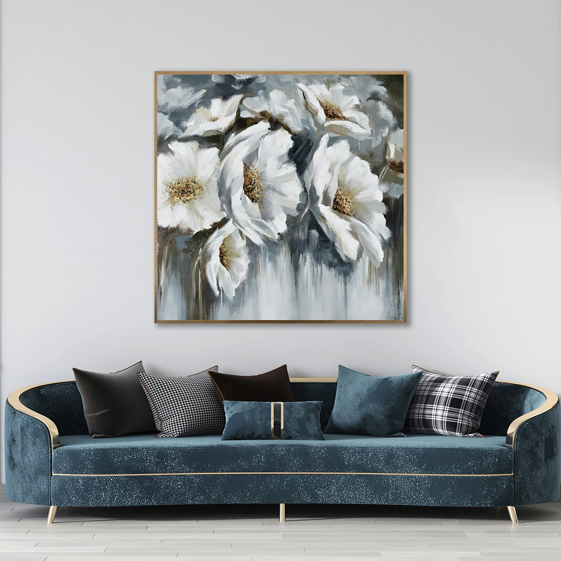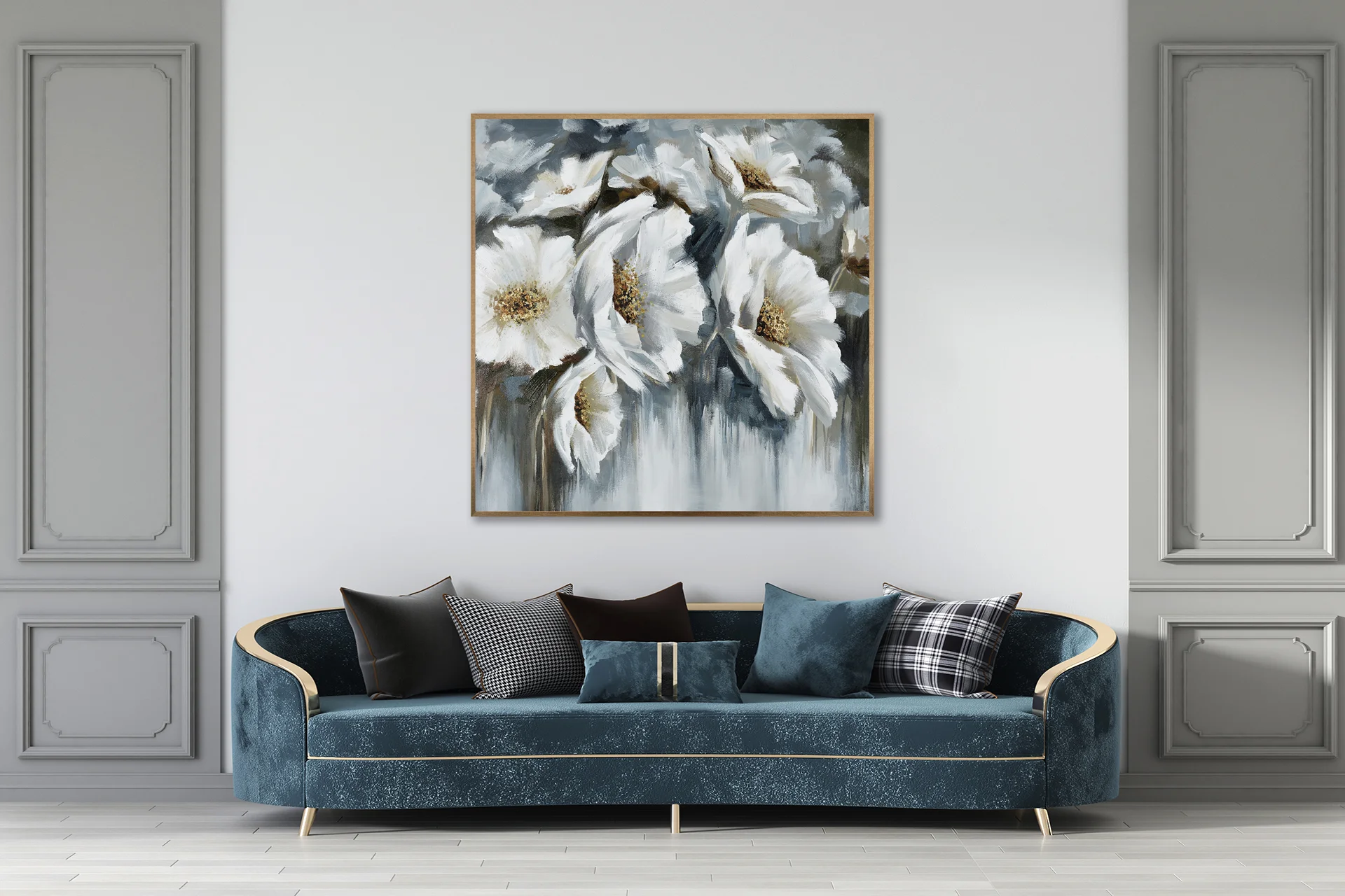 Yağlı Boya Dokulu Tablo Gri Altın Fonda Beyaz Çiçekler Altın Çerçeveli