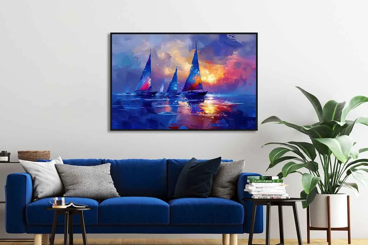 Yağlı Boya Dokulu Tablo Modern Denizde Yelkenliler Siyah Çerçeveli