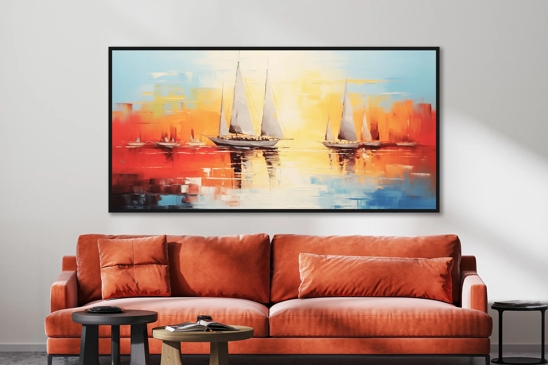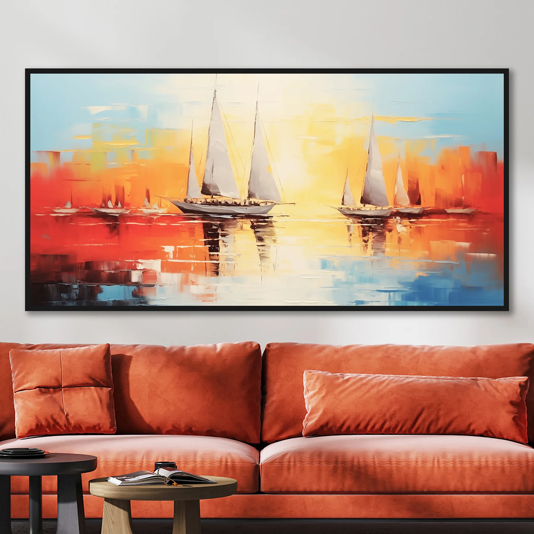 Yağlı Boya Dokulu Tablo Gün Batımında Modern Yelkenliler Siyah Çerçeveli