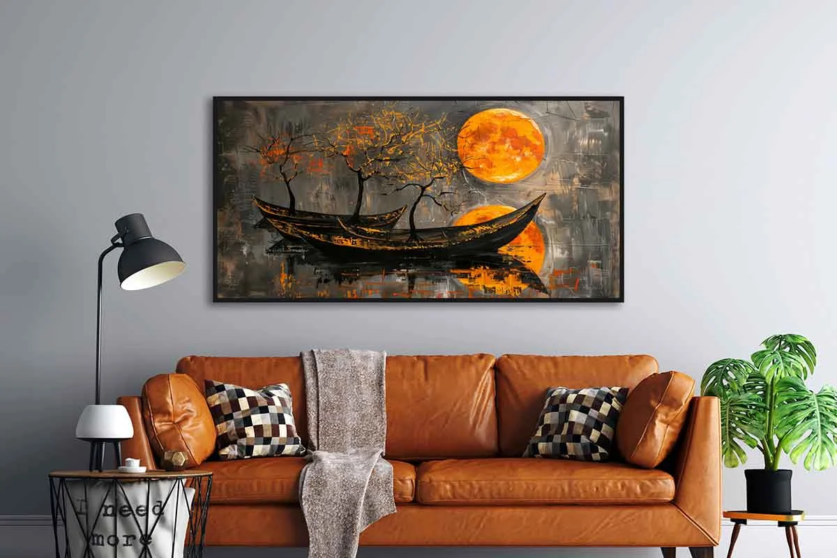 Yağlı Boya Dokulu Tablo Modern Güneş ve Gondollar Siyah Çerçeveli